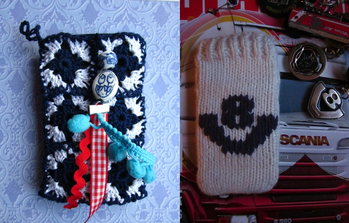 Hierboven twee mobielhoesjes die ik zelf hebt gemaakt. De linker is gehaakt en geïnspireerd op Delfts Blauw. De rechter is gebreid voor de smartphone van mijn zoon die, vanwege zijn voorliefde voor vrachtwagens, er graag een wilde met het V8-logo van de Scania. Voor de juiste garenkeuze heb ik me laten adviseren door mijn favoriete handwerkwinkel De Pauw.